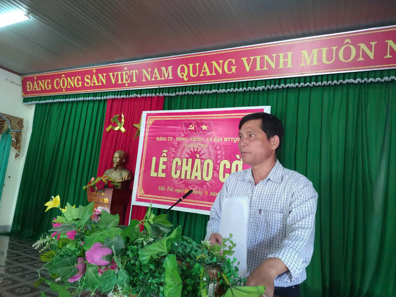 Sáng dạy chuông điện thoại của ban tổ chức lễ chào cờ như mọi khi mỗi lần chào cờ lại lên chuông "khân trương" hoặc "Các đồng chí không quên buổi chào cờ của chúng ta nhé" đó là lời nhắn của đồng chí chủ tịch xã và VP- TK nhắc nhở anh chị em trong cơ quan. Như mọi khi các đồng chí các phòng, ban, ngành, Mặt trận đoàn thể hay những chiến sĩ công an, các chiến sĩ DQTT xã đã có mặt từ sớm. Ban tổ chức tiếp tục điểm danh từng đồng chí từng phòng ban năm sỉ số rồi xin ý kiến chủ tịch, được chủ tịch thống nhất mới tiến hành chào cờ không kém nghiêm trang.