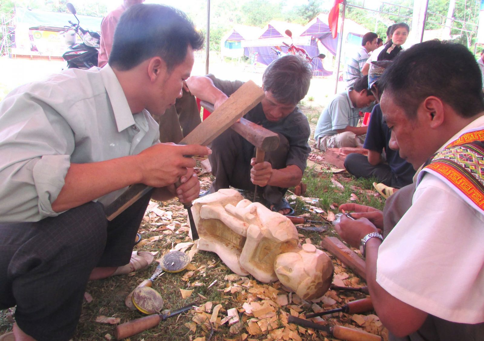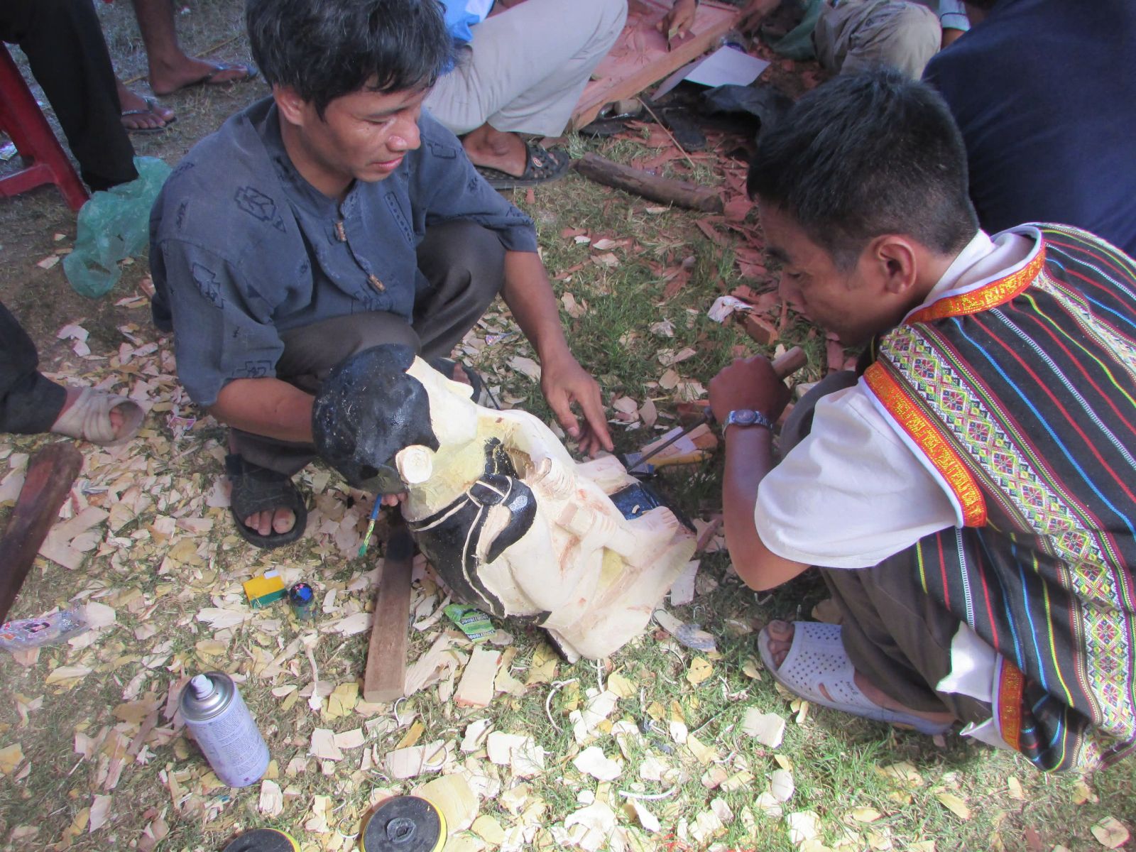 Tháng 8, trời vùng cao Nam Giang đang là cao điểm của mùa nắng nóng miền Trung, nhưng bên trong ngôi nhà làng truyền thống (Su moong) của người Tà Riềng thôn Đắc Rích (xã Đắc Tôi) thỉnh thoảng chúng tôi bắt gặp vẫn không thiếu những cơn gió và bầu không khí mát mẻ đặc trưng của vùng Trường Sơn cùng với những nghệ nhân trẻ anh Zơ Râm Vệm, Zơ Râm Niên, Zơ Râm Cường, anh Zơ Râm Vuôn miệt mài bên những tác phẩm điêu khắc.