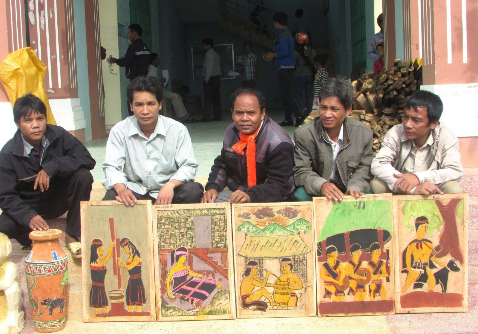 Các nghệ nhân bên tác phẩm điêu khắc của mình được đi tham gia hội thi tại hội thi liên hoan âm vang cồng chiêng huyện Nam Giang lần thứ lần thứ IV năm 1017