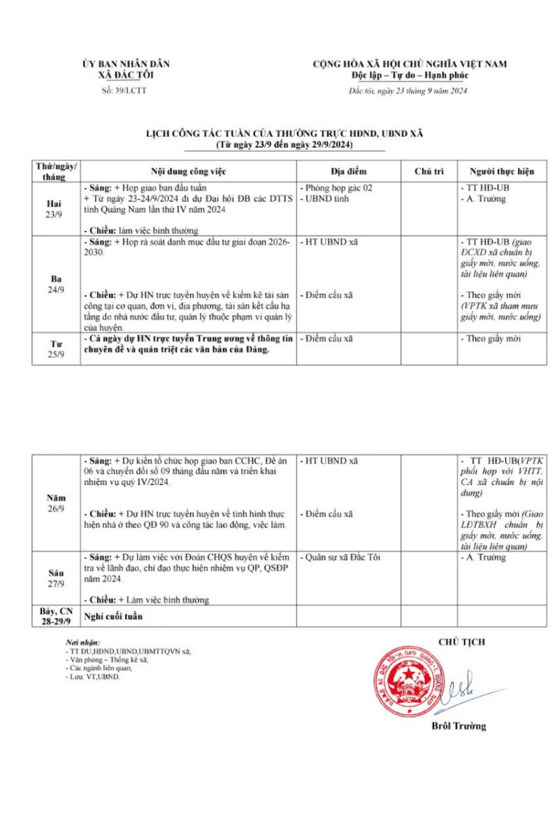 LỊch công tác tuần của thường trục HĐND, UBND xã từ ngày 23/9 - 29/9/2024