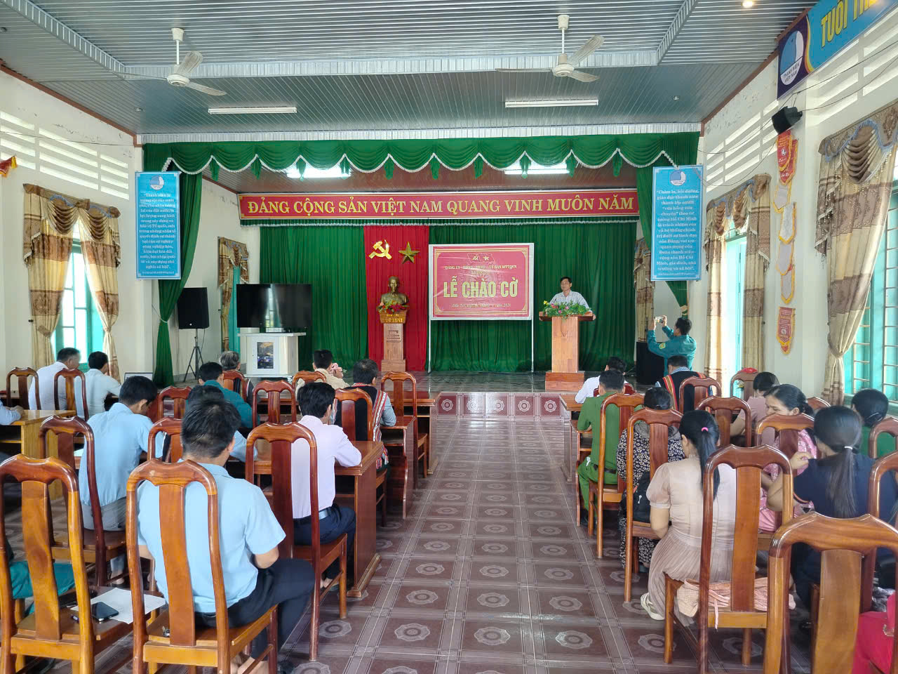 Sáng dạy chuông điện thoại của ban tổ chức lễ chào cờ như mọi khi mỗi lần chào cờ lại lên chuông "khân trương" hoặc "Các đồng chí không quên buổi chào cờ của chúng ta nhé" đó là lời nhắn của đồng chí chủ tịch xã và VP- TK nhắc nhở anh chị em trong cơ quan. Như mọi khi các đồng chí các phòng, ban, ngành, Mặt trận đoàn thể hay những chiến sĩ công an, các chiến sĩ DQTT xã đã có mặt từ sớm. Ban tổ chức tiếp tục điểm danh từng đồng chí từng phòng ban năm sỉ số rồi xin ý kiến chủ tịch, được chủ tịch thống nhất mới tiến hành chào cờ không kém nghiêm trang.
