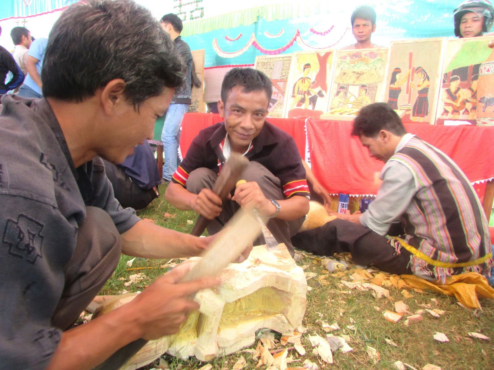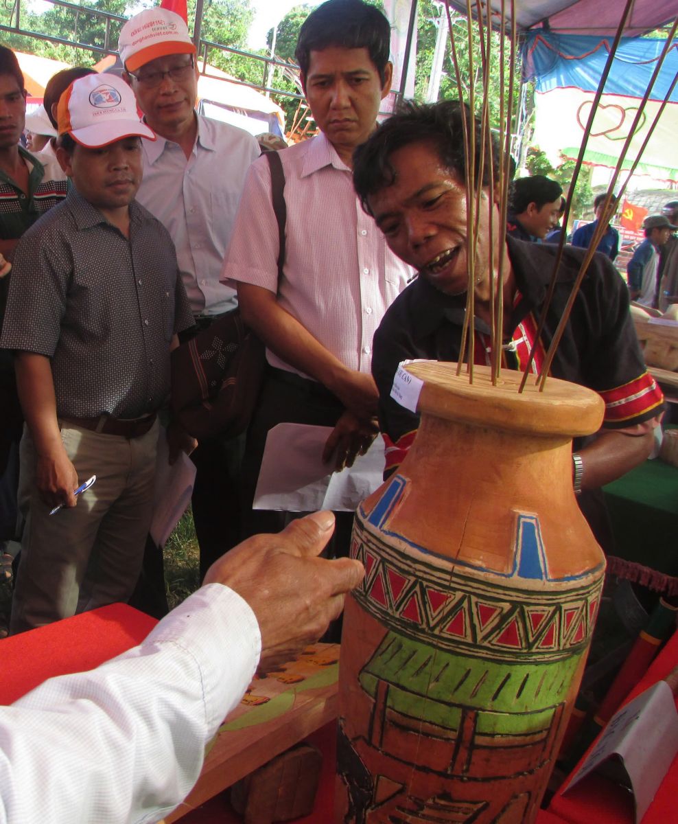 Các nghệ nhân bên tác phẩm điêu khắc của mình được đi tham gia hội thi tại hội thi liên hoan âm vang cồng chiêng huyện Nam Giang lần thứ lần thứ IV năm 1017