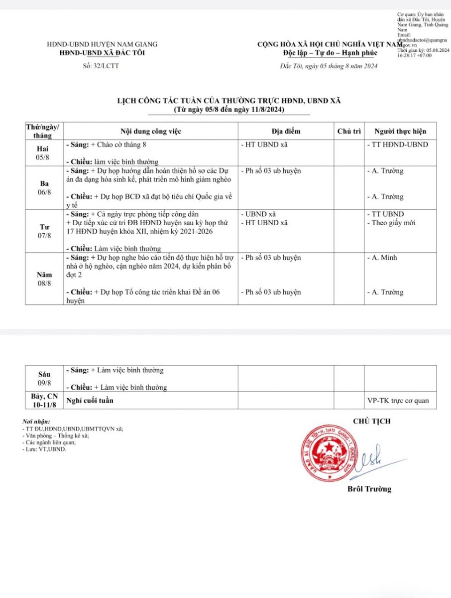 LỊch công tác tuần của thường trục HĐND, UBND xã từ ngày 05/8 - 11/8/2024